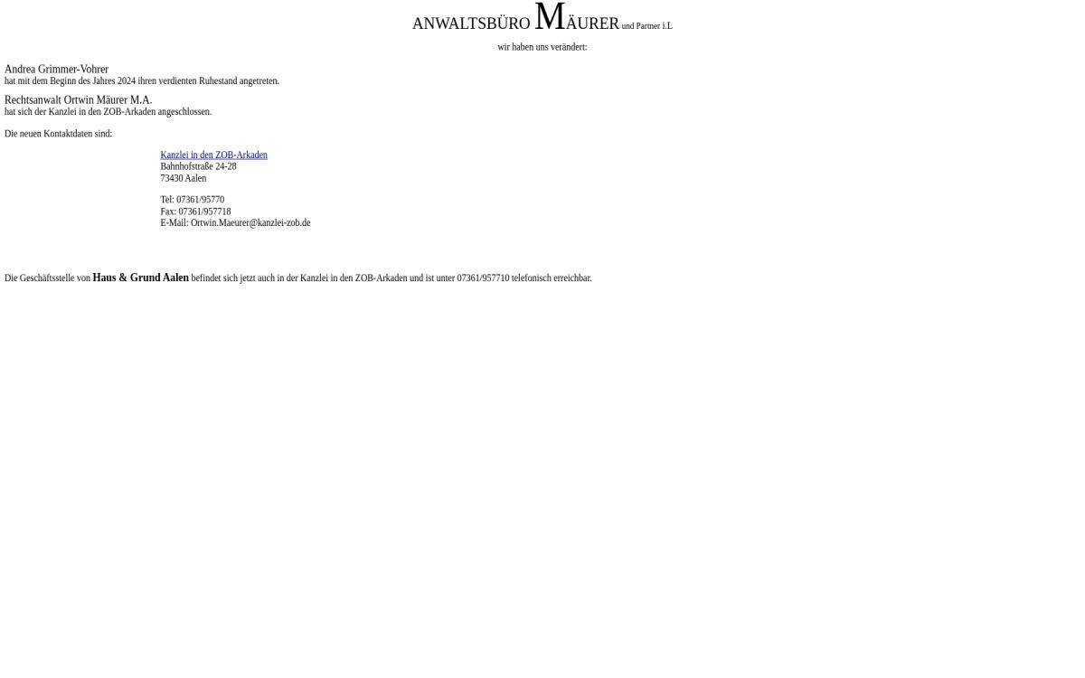 Es handelt sich hierbei nicht um einen Werbeeintrag von Ortwin Mäurer, Rechtsanwalt, Aalen. Sollten Sie fehlerhafte Daten bemerken, dann kontaktieren Sie uns bitte. Wir werden die Daten prüfen und korrigieren.