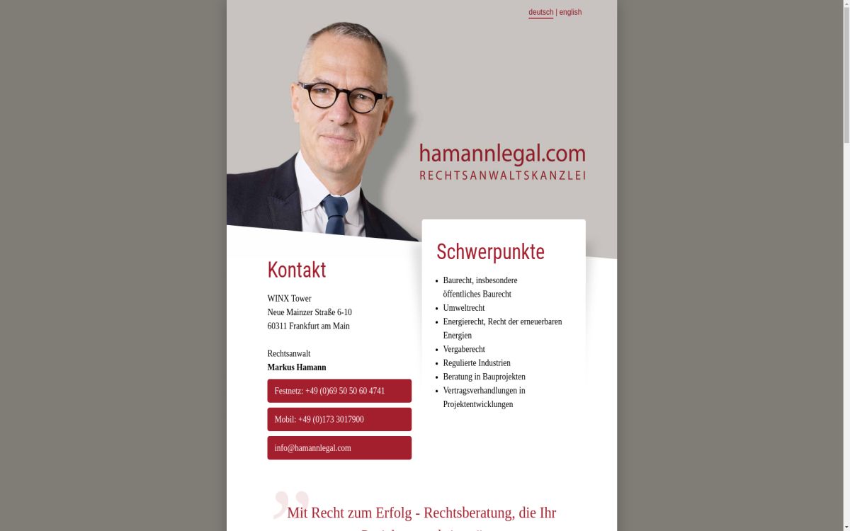 Es handelt sich hierbei nicht um einen Werbeeintrag von Markus Hamann, Rechtsanwalt, Frankfurt am Main. Sollten Sie fehlerhafte Daten bemerken, dann kontaktieren Sie uns bitte. Wir werden die Daten prüfen und korrigieren.