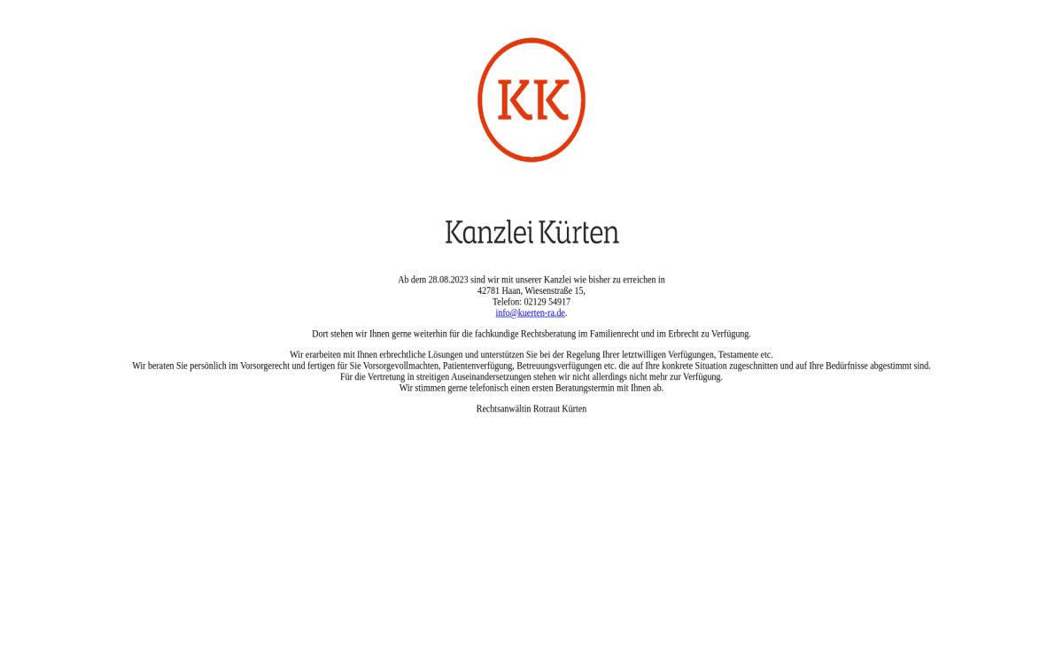 Es handelt sich hierbei nicht um einen Werbeeintrag von Rotraut Kürten, Rechtsanwältin, Haan. Sollten Sie fehlerhafte Daten bemerken, dann kontaktieren Sie uns bitte. Wir werden die Daten prüfen und korrigieren.